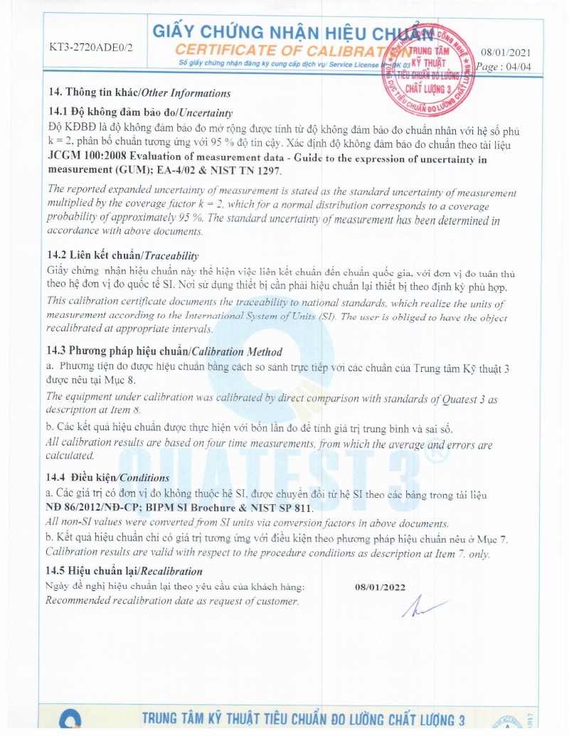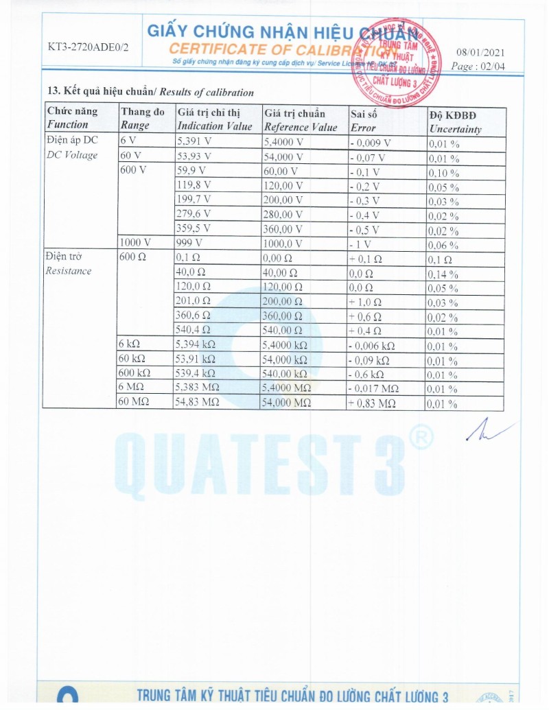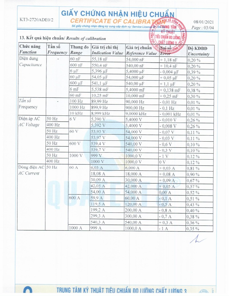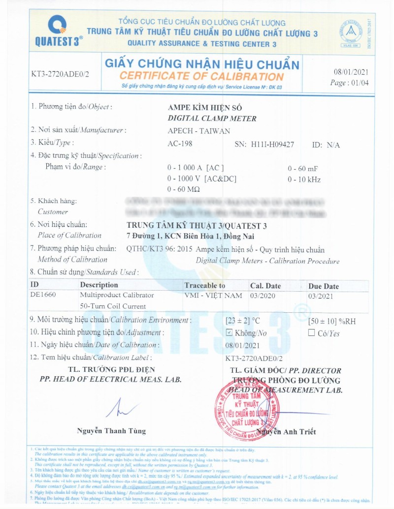 Giấy chứng nhận ampe kìm APECH AC-198 đạt kết quả hiệu chuẩn được cấp bởi QUATEST 3 với sai số các thang đo rất thấp