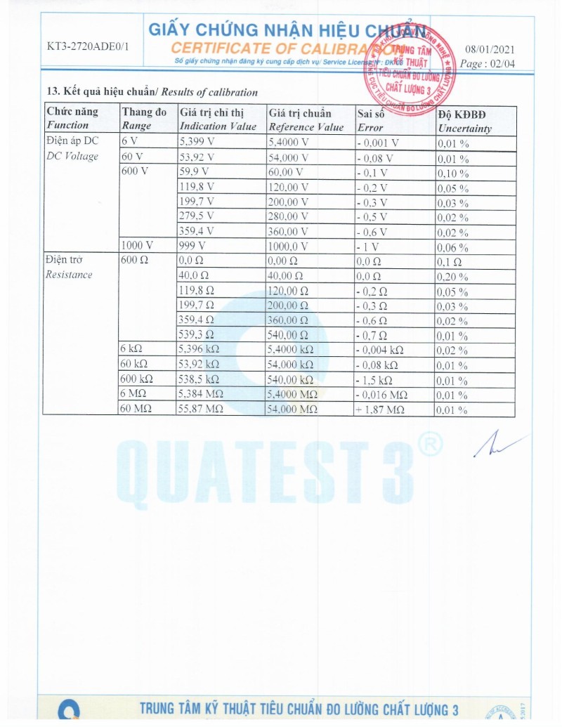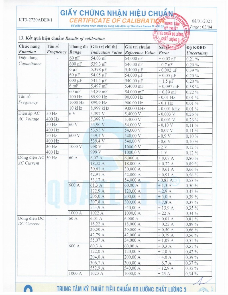 Ampe kìm APECH AC-199 đạt giấy chứng nhận hiệu chuẩn được cấp bởi QUATEST 3 với sai số rất thấp ở hầu hết các thang đo