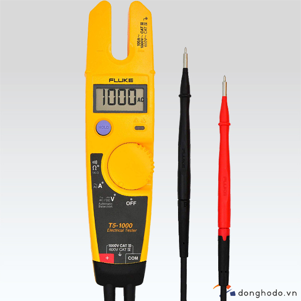 Ampe kìm đo dòng AC FLUKE T5-1000 kiểm tra điện áp, tính liên tục và dòng điện bằng một công cụ nhỏ gọn. Với T5, tất cả những gì bạn phải làm là chọn volts, ohms, hoặc dòng điện và bộ kiểm tra thực hiện phần còn lại. OpenJaw hiện tại cho phép bạn kiểm tra hiện tại lên đến 100A – mà không vi phạm mạch.