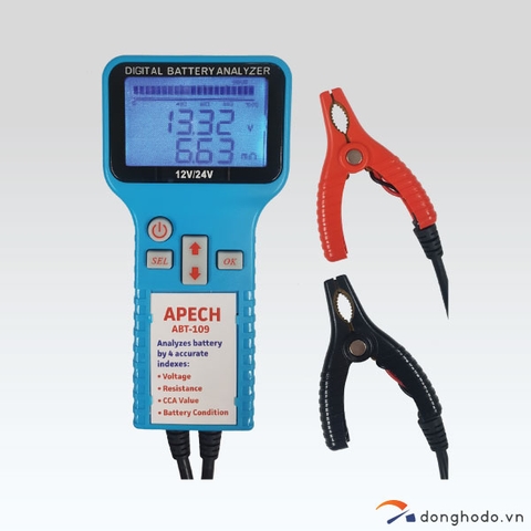 Thiết bị kiểm tra pin, ắc quy APECH ABT 109-24V kiểm tra được nhiều thông số kỹ thuật của ắc quy, không cần sử dụng pin, hiển thị rõ ràng, dễ dàng thao tác sử dụng.